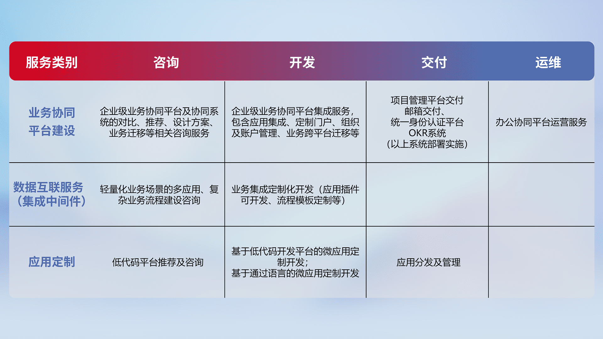 针对钉钉、、、企微、、IDaas等平台级产品提供产品的规划、、、方案、、交付、、、定制化开发等服务,,实现如统一协同办公、、、智能客户服务、、、混合会议管理、、、、智能数据查询、、、、等业务场景,,,实现数字化转型。。。。