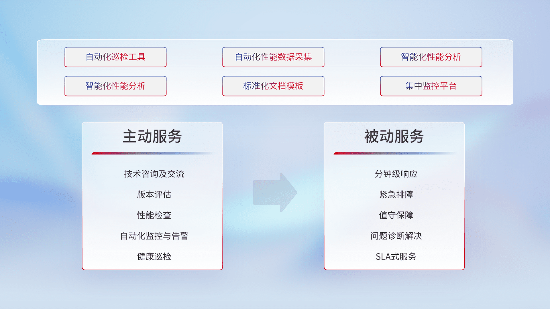 智能化工具和标准化文档,,,,保障服务质量,,,提供主动服务(包含技术咨询、、、、版本评估、、、性能检查、、、、自动化监控与告警、、、、健康巡检)和被动服务包含(分钟级响应、、、、紧急排障、、值守保障、、、、问题诊断解决、、、SLA服务)。。。